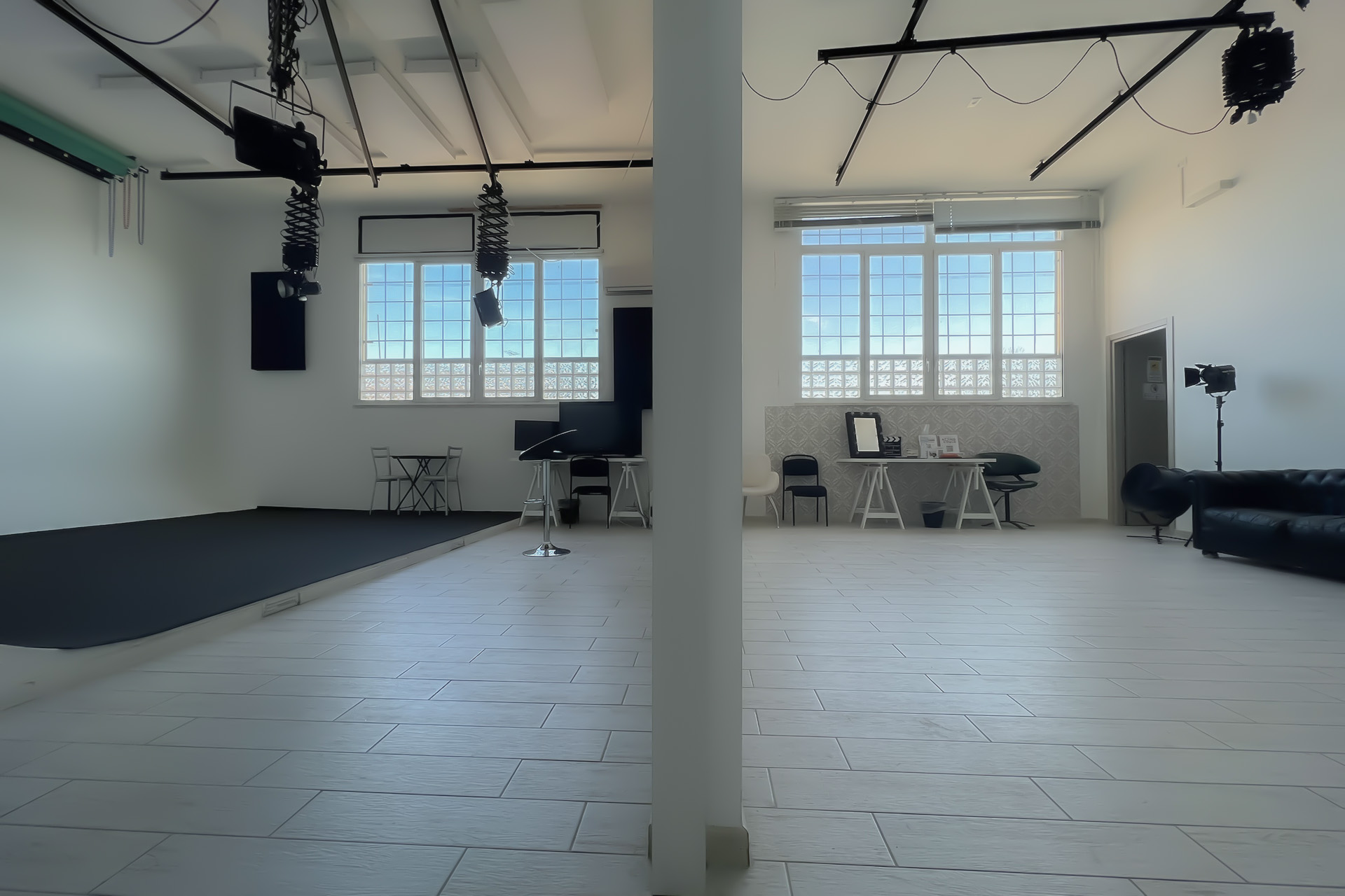 Sala in daylight oscurabile da 50mq con limbo di calpestabilità 4,5 x 6,5 cm, con porta fondale da 3 rulli, impianto aereo a 5 ponti e 4 luci led continue e possibilità di Green Screen.